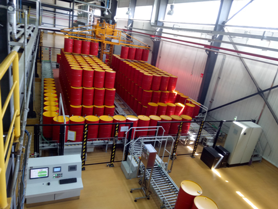 本系統用于包裝容器或成品的生產現場的短期入庫,堆積,輸送出庫。全過程為智能無人操作,只需一鍵輸入生產目標值,該系統即可以此目標值,全程自動運行。可遠程監控;可記錄入,存,出數量及品種;可與上,下游自動流水生產線自動對接。