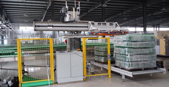 該設(shè)備用于將成垛的空玻璃瓶,拆垛后,輸送至自動流水灌裝線輸送帶上。此機(jī)型適用于10000-18000瓶/小時的生產(chǎn)速度。
